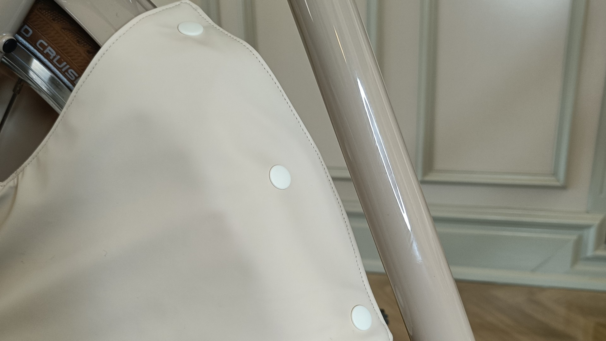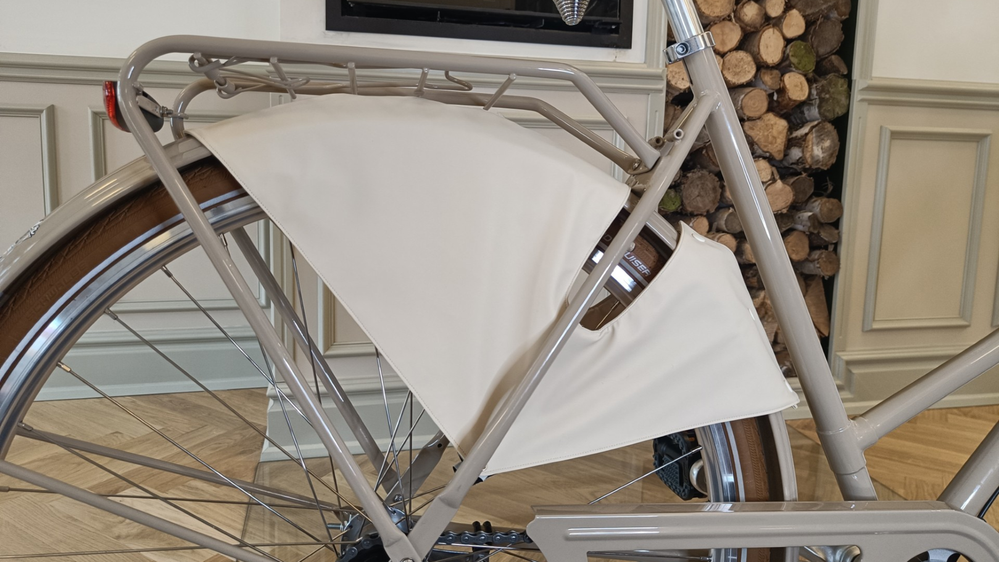 Gør din cykeltur mere komfortabel og elegant med denne stilfulde beige frakkeskåner – en praktisk detalje, der fuldender dit cykeludstyr.
