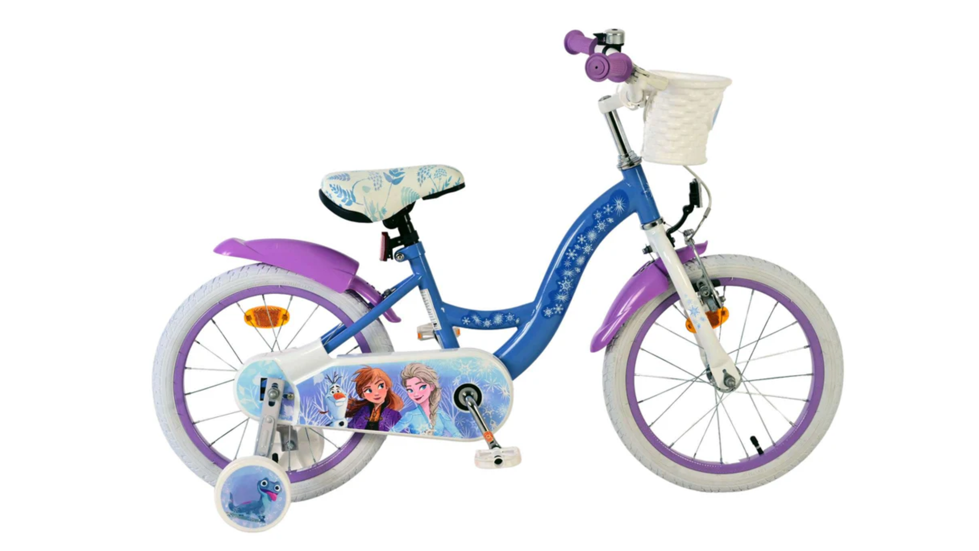 Sikkerhed er altafgørende! Derfor har denne fede cykel håndbremse, fodbremse og aftagelige støttehjul. Komfort er også blevet tænkt ind. Den smukke blå Frozen-cykel leveres med en kurv. For at sikre, at du kan nyde cyklen så længe som muligt, er sadlen og styret højdejusterbare.