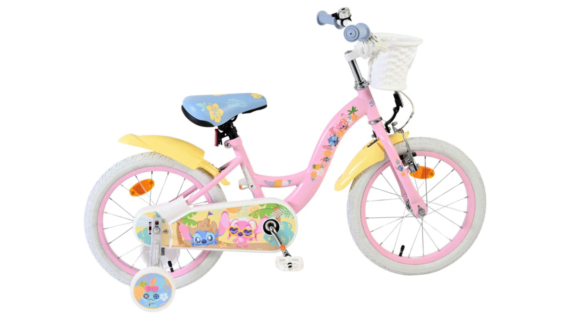 Disney Stitch 16-tommer børnecyklen er et sandt blikfang! Med sit muntre lyserøde stel og solgule skærme vil denne cykel øjeblikkeligt bringe et smil frem på alles ansigt. Den søde kurv foran gør cyklen ekstra legesyg og praktisk til at bære yndlingsting i.