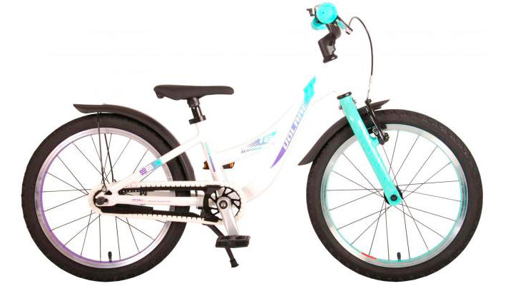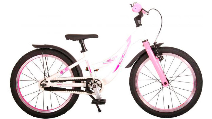 Volare Glamour 18 tommer børnecykel. Den smukke Volare Glamour cykelserie er af overlegen kvalitet. Rammen på denne cykel er lavet af ultra let legering, kun 6,5 kilo!. Også dele som styr og cykelklokke er lavet af legering. For at reducere hastigheden har cyklen et sikkert aluminium V-bremsesystem med både håndbremse og kørebremse. Cyklen har ingen træningshjul, men et praktisk og stærkt aluminiumsstativ. Grebene er lavet af Kraton, et vidunderligt blødt gummi, som gør dem mere behagelige at holde på, mens de cykler. Sadelrøret er ekstra lavt med en ekstra lang sadelpind, så cyklen kan vokse med dit barn. Derudover har cyklen et smart styresystem i aluminium, som sørger for, at styret er begrænset (ikke justerbar i højden). Den robuste kædeskærm er en fantastisk tilføjelse til det kraftfulde, men glamourøse design på denne cykel med dens slanke legeringsramme og pink vandoverførselsmærkater. Cyklen er 85% samlet. De 18 tommer pneumatiske dæk gør denne cykel velegnet til piger mellem 4 og 7 år med tøjstørrelse 104-116. Denne Volare Glamour børnecykel inspirerer enhver pige til at opdage sin verden!