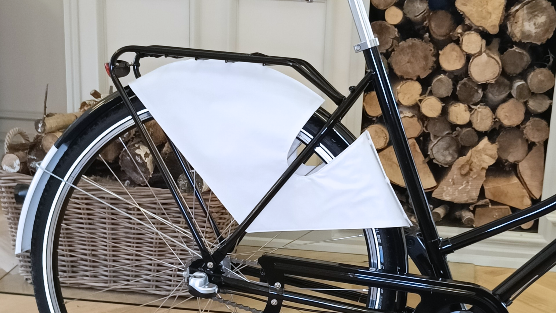 Hvid frakkeskåner til 28” cykelhjul – håndlavet beskyttelse med klassisk look