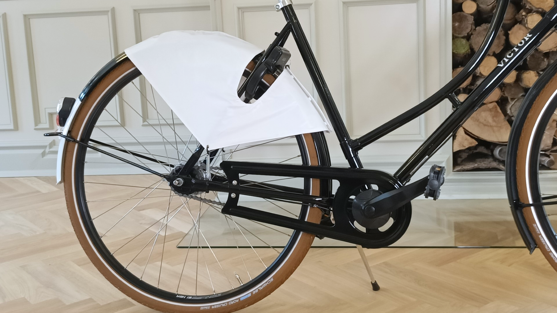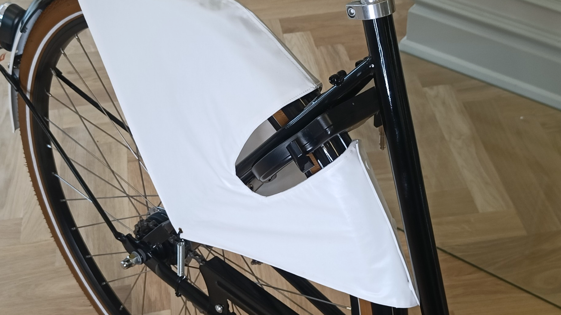 Gør din cykeltur mere komfortabel og elegant med denne stilfulde hvide frakkeskåner – en praktisk detalje, der fuldender dit cykeludstyr.