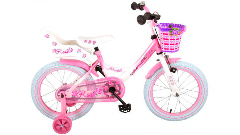Sikkerhed kommer først! Derfor har denne seje cykel håndbremse og kørebremse og lukket kædekasse. Derudover har cyklen aftagelige sidehjul, reflekser i pedalerne og en flot klokke. Der er også tænkt på komfort. Den smukke lyserøde Volare-cykel med hvide accenter har et dukkesæde under sadlen, en kurv til at bære alle dine ting og et super robust stel. For at nyde cyklen så længe som muligt, er sadlen og styret justerbare i højden. Kort sagt: en topkvalitetscykel, dit barn vil nyde i mange år fremover!