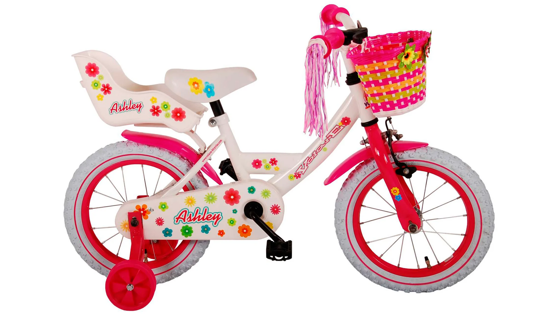 Sikkerhed kommer først! Derfor har denne seje cykel håndbremse og kørebremse og lukket kædekasse. Derudover har cyklen aftagelige sidehjul, reflekser i pedalerne og en flot klokke. Der er også tænkt på komfort. Den smukke blomstrede hvide Volare-cykel har et dukkesæde under sadlen, en kurv til at bære alle dine ting, et super robust stel og sjov dekoration på styret. For at nyde cyklen så længe som muligt, er sadlen og styret justerbare i højden. Kort sagt: en topkvalitetscykel, dit barn vil nyde i mange år fremover!